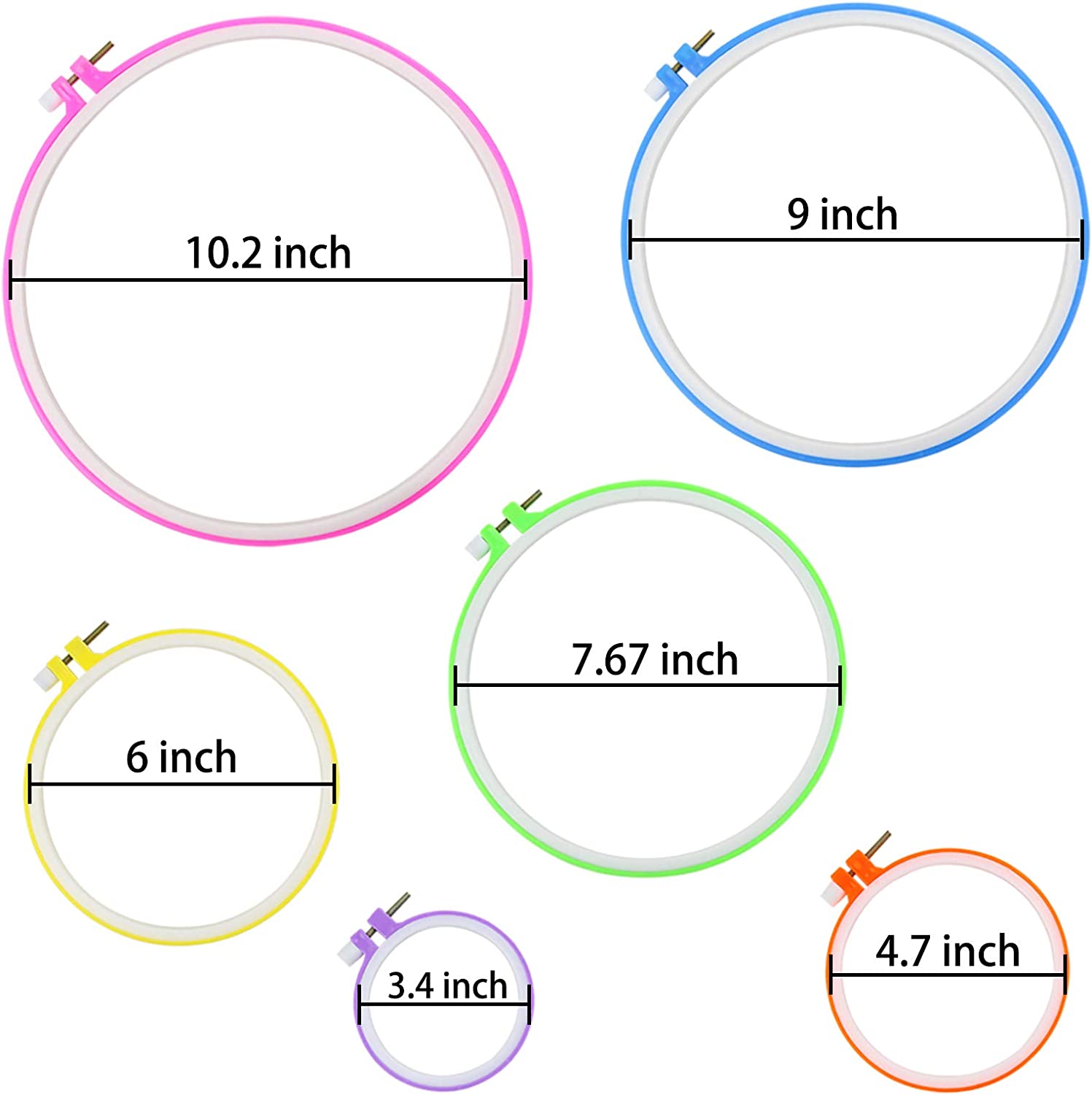Multiple Size Embroidery Hoops: 10.2 in (26cm), 9 in (22.8cm), 7.67 in (19.5cm), 6in (15.3cm) ,4.7 in (12cm) and 3.4in(8.6cm).