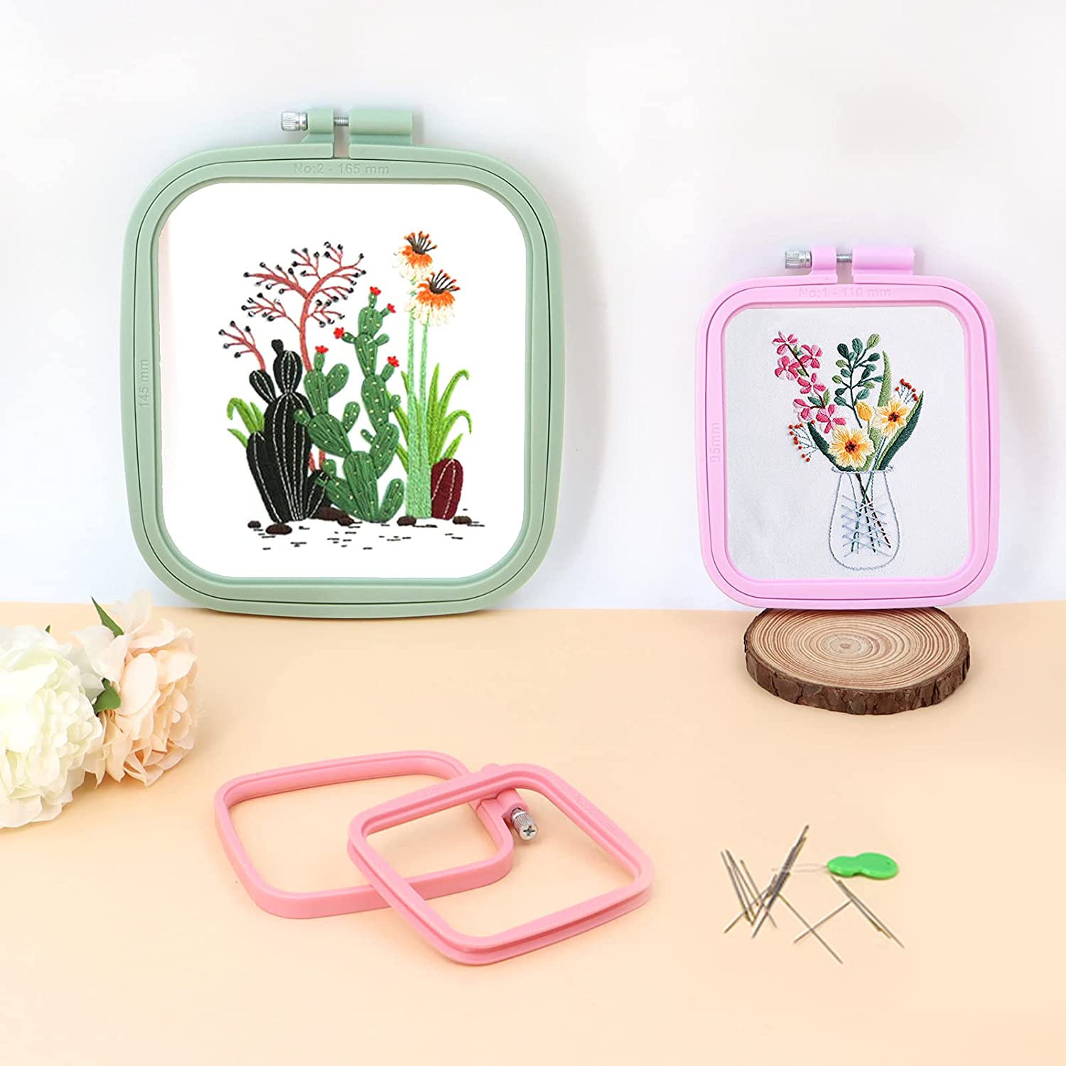 PREMIUM ABS PLASTIC]—-The exceptional ABS plastic brings about nice finish smooth and good wear resistance, making our plastic embroidery hoops sturdy and durable. 3 colors (pink/purple/green) can go with different sewing projects or decorations, meeting varied needs and styles.
