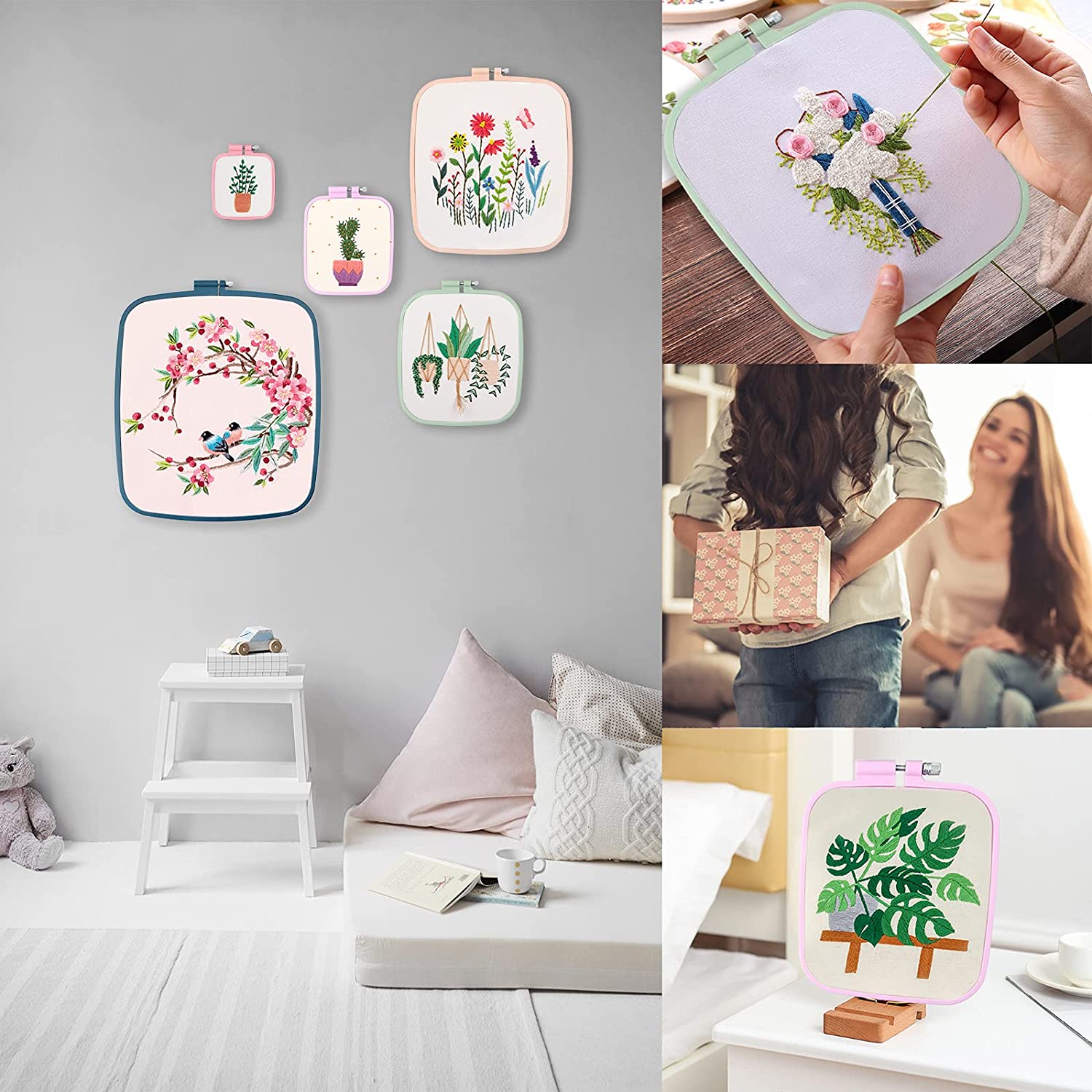 [VERSATILE USAGE]—-Quality sewing hoop is a good helper for embroidery enthusiasts. Hang your finished project along with the colored hoop on the wall as a creative decoration, or use it as Christmas/party embellishment and dreamcatcher. Gifting your family and friends into embroidery or cross stitch with our hoops for crafts would be a good idea.