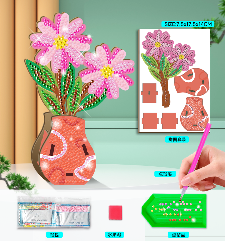 DIY Crystal Art Pink Daisy Flower Pot is new designs, made with wood material and diamond art beads, finished product size is 7.5×17.5x14cm. Perfect to decorate your home.
