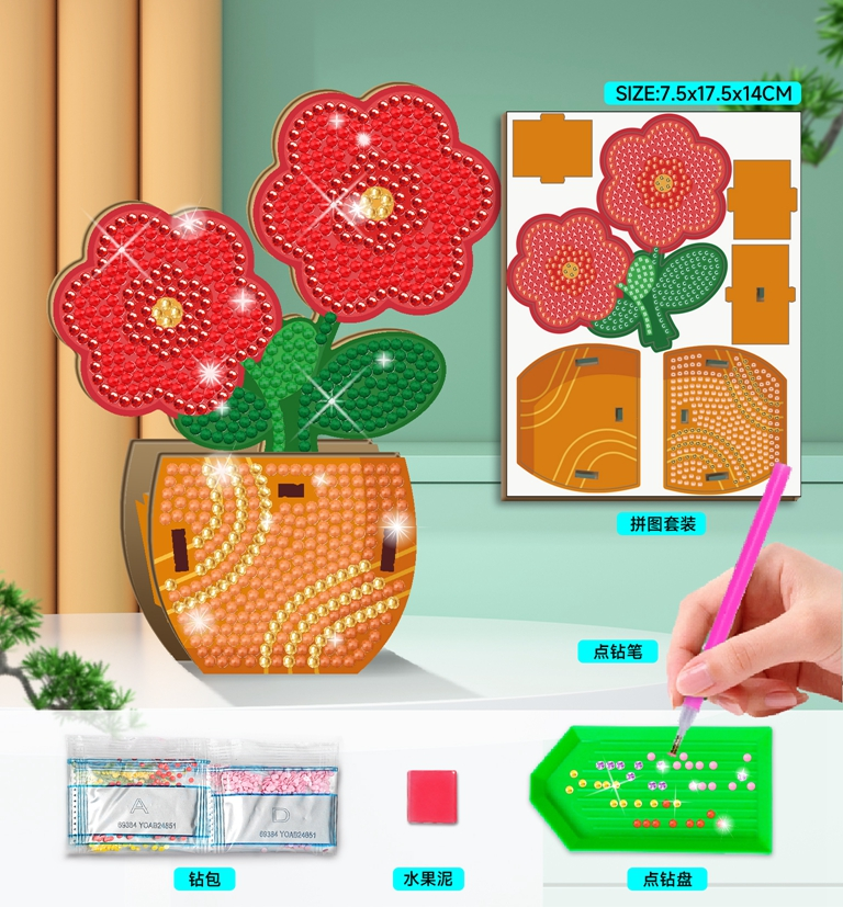DIY Crystal Art Red Rose Flower Pot is new designs, made with wood material and diamond art beads, finished product size is 7.5×17.5x14cm. Perfect to decorate your home.