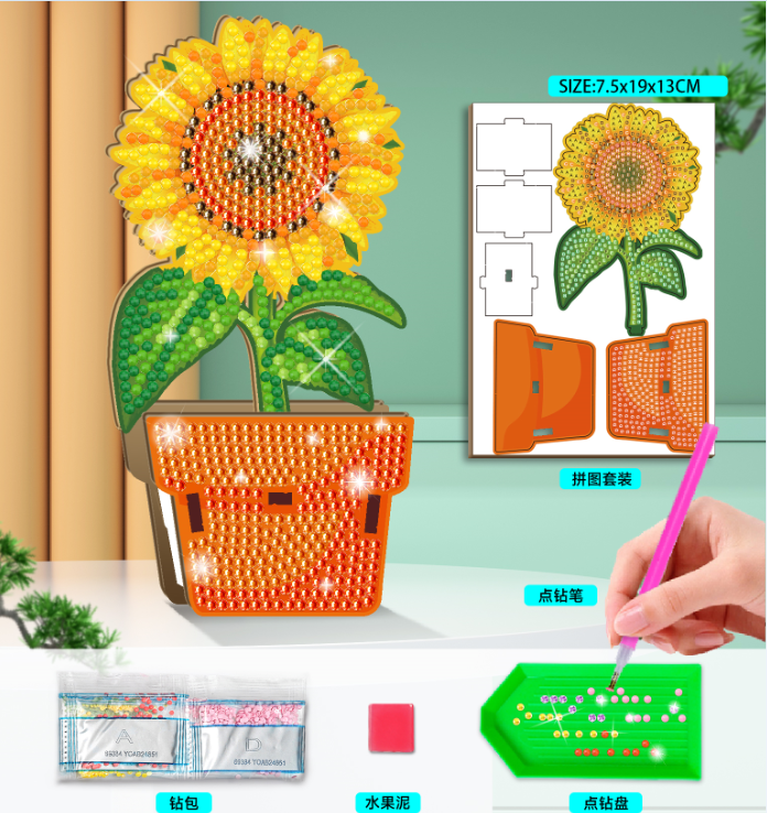 DIY Crystal Art Sunflower Flower Pot is new designs, made with wood material and diamond art beads, finished product size is 7.5x19x13cm. Perfect to decorate your home.