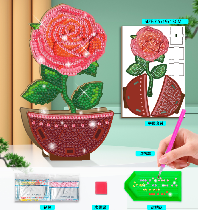 DIY Diamond Art Rose Flower Pot is new designs, made with wood material and diamond art beads, finished product size is 7.5x19x13cm. Perfect to decorate your home.