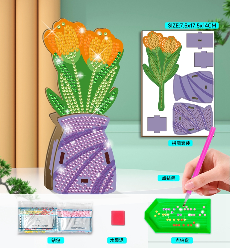 DIY Diamond Art Tulip Flower Pot is new designs, made with wood material and diamond art beads, finished product size is 7.5×17.5x14cm. Perfect to decorate your home.