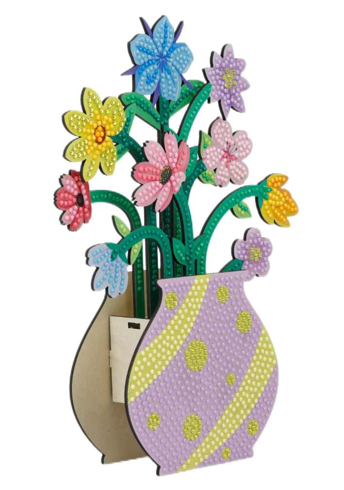 DIY Diamond Art Yellow and Purple Flower Vase new and hot selling, made with wood material and diamond art beads, finished product size is 22×27.5x5cm. Perfect to decorate your home.